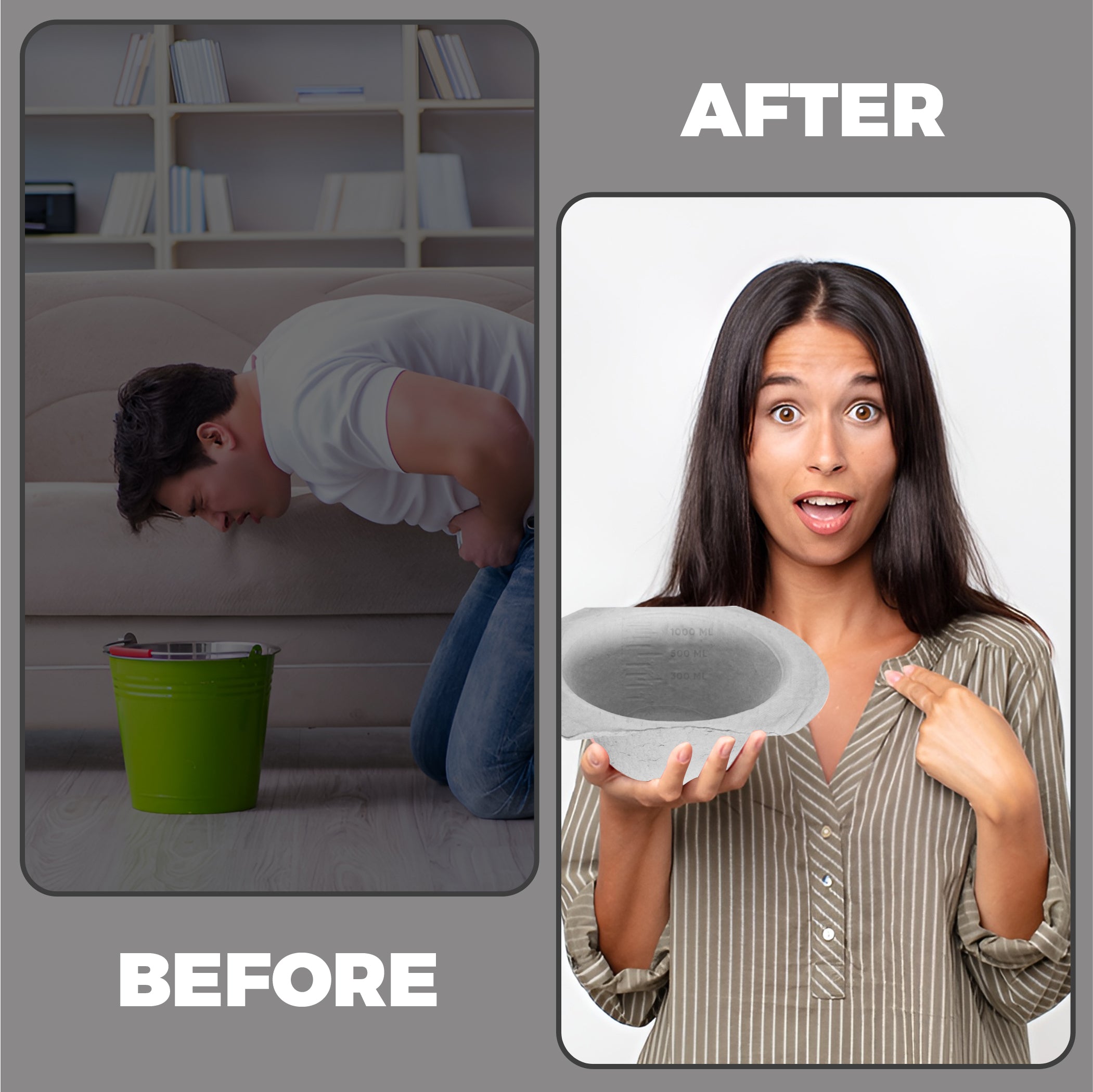 CONVENIENT 1000 ML CAPACITY: With a 1000ml maximum capacity, our sick bowls provide ample space to manage nausea or vomiting without overflow.