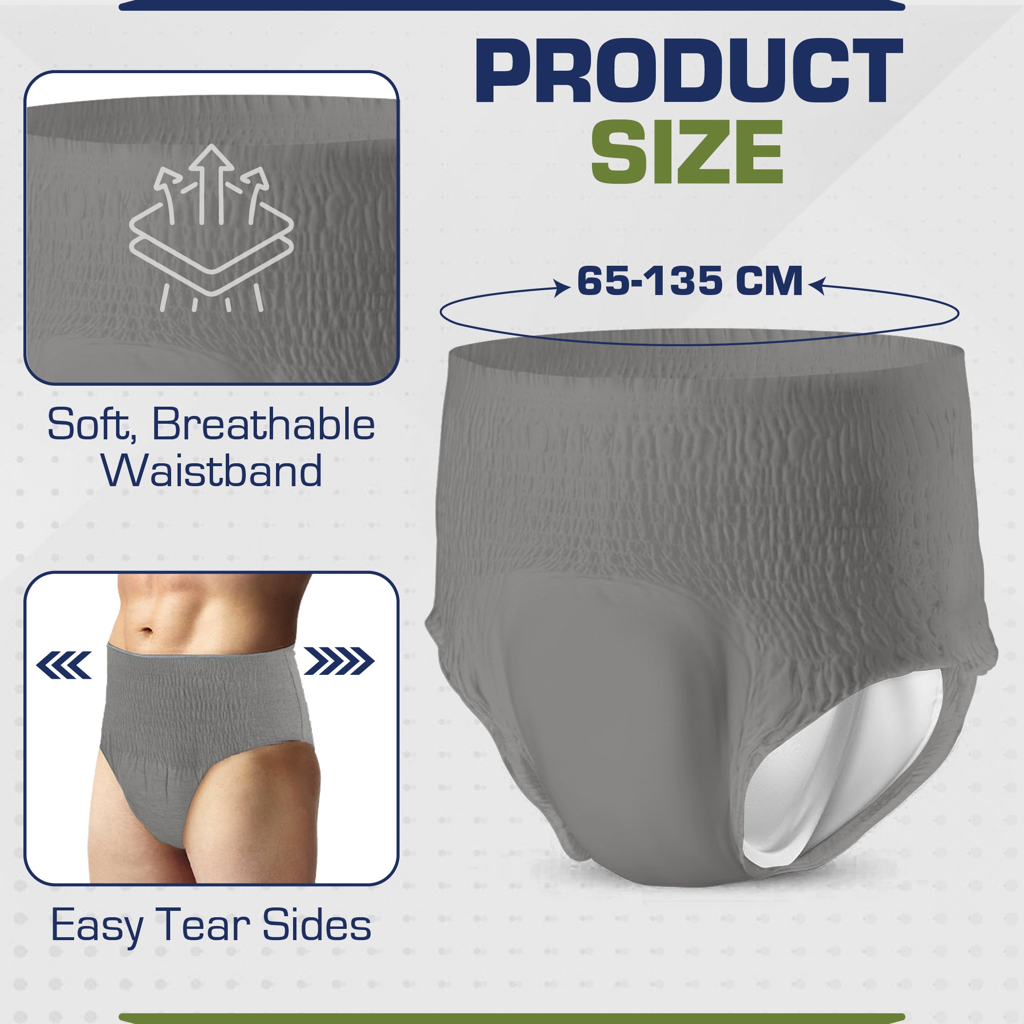 ANTI-LEAK GUARDS: ViraCare adult nappies for men include built-in anti-leak guards that offer reliable protection against leaks during the day or night. ViraCare incontinence pants for men provide a secure and comfortable fit, helping to prevent accidents. The adults pull ups topsheet, enhanced with cotton, effectively wicks away moisture keeping the skin dry and irritation-free.
