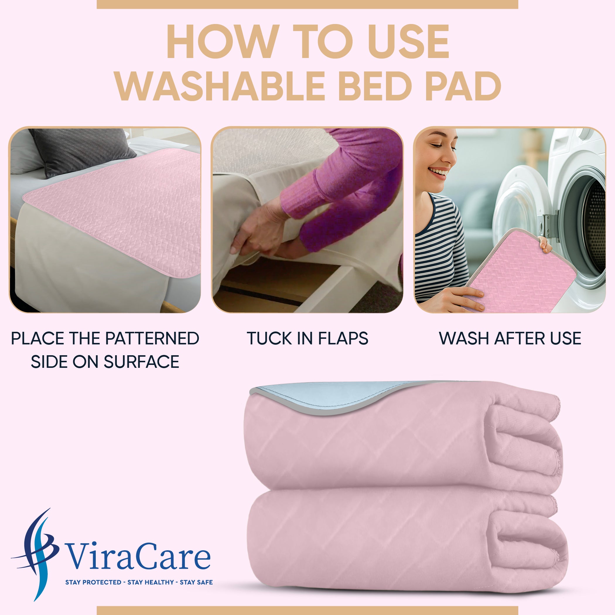 MACHINE WASHABLE, DURABLE & SECURE FIT: Waterproof mattress protector are machine washable and dryer-friendly, built to withstand repeated laundering without losing their shape or absorbency. ViraCare Bed mats include extended tuck-in flaps which secure the pad firmly under the mattress to prevent bunching or slipping. Stay protected with a pad that stays in place all night.