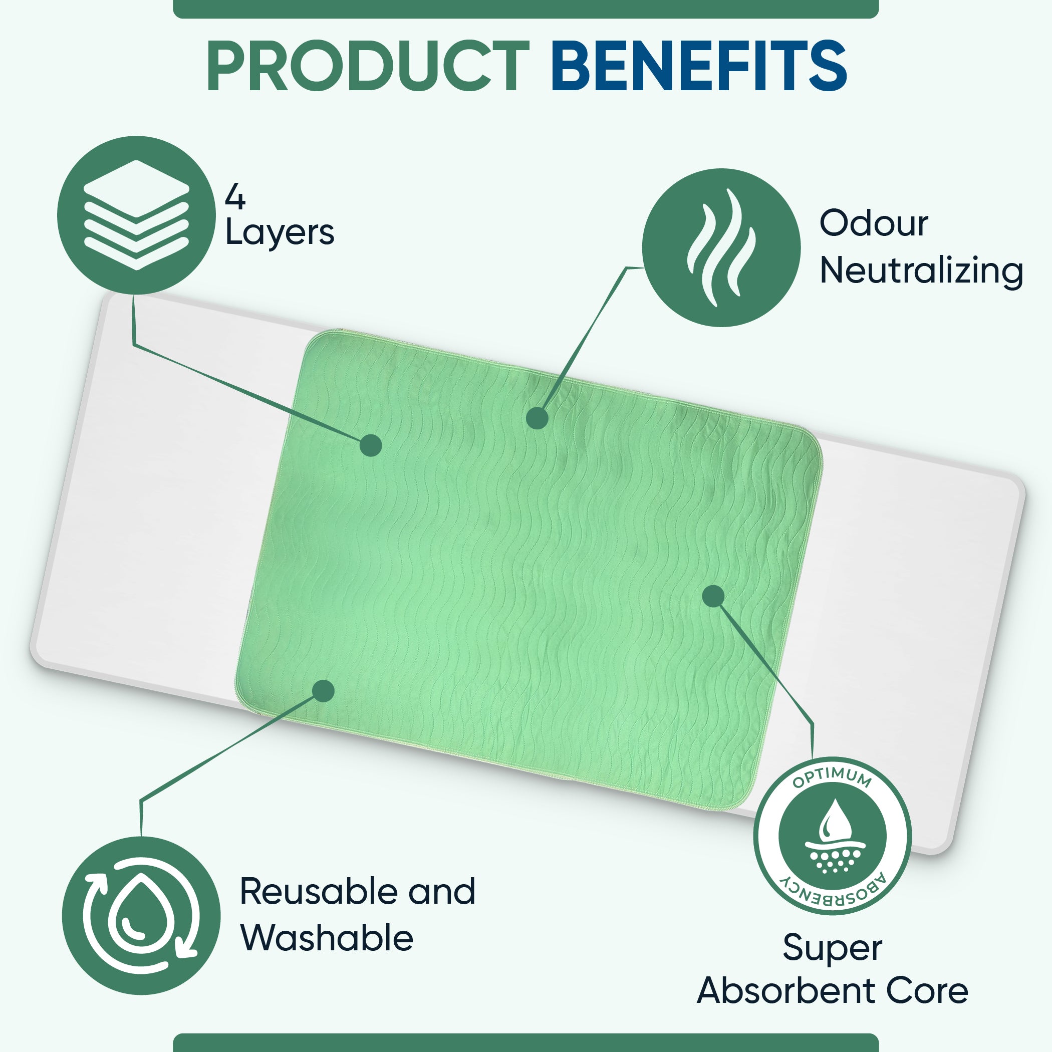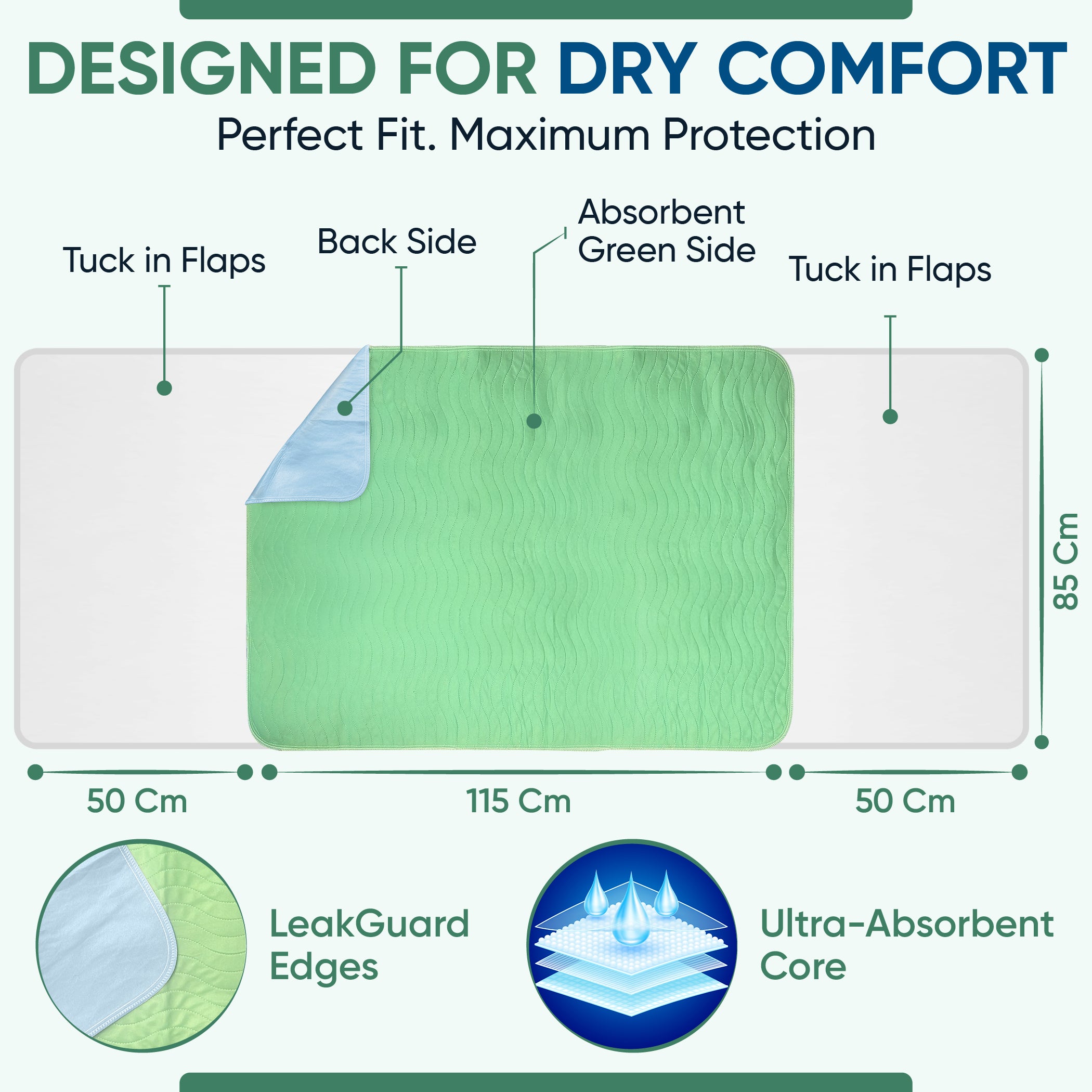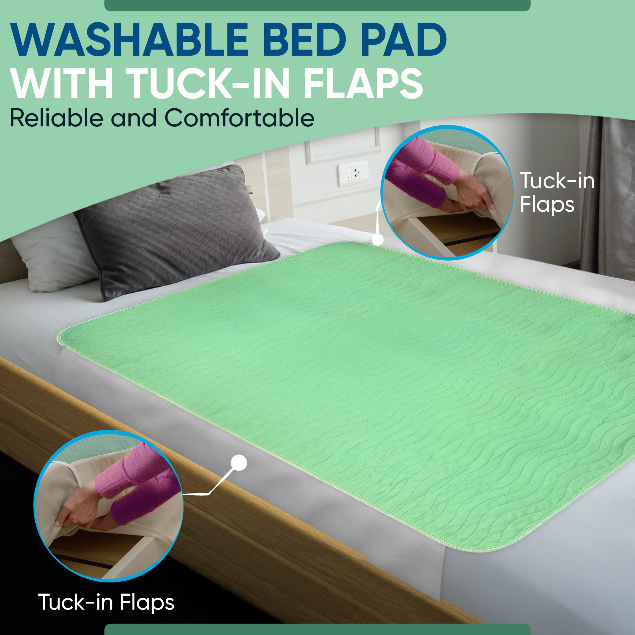 Green Incontinence Bed Pads: 85x115 cm, Washable, With Tucks/Flaps (Qty:2)