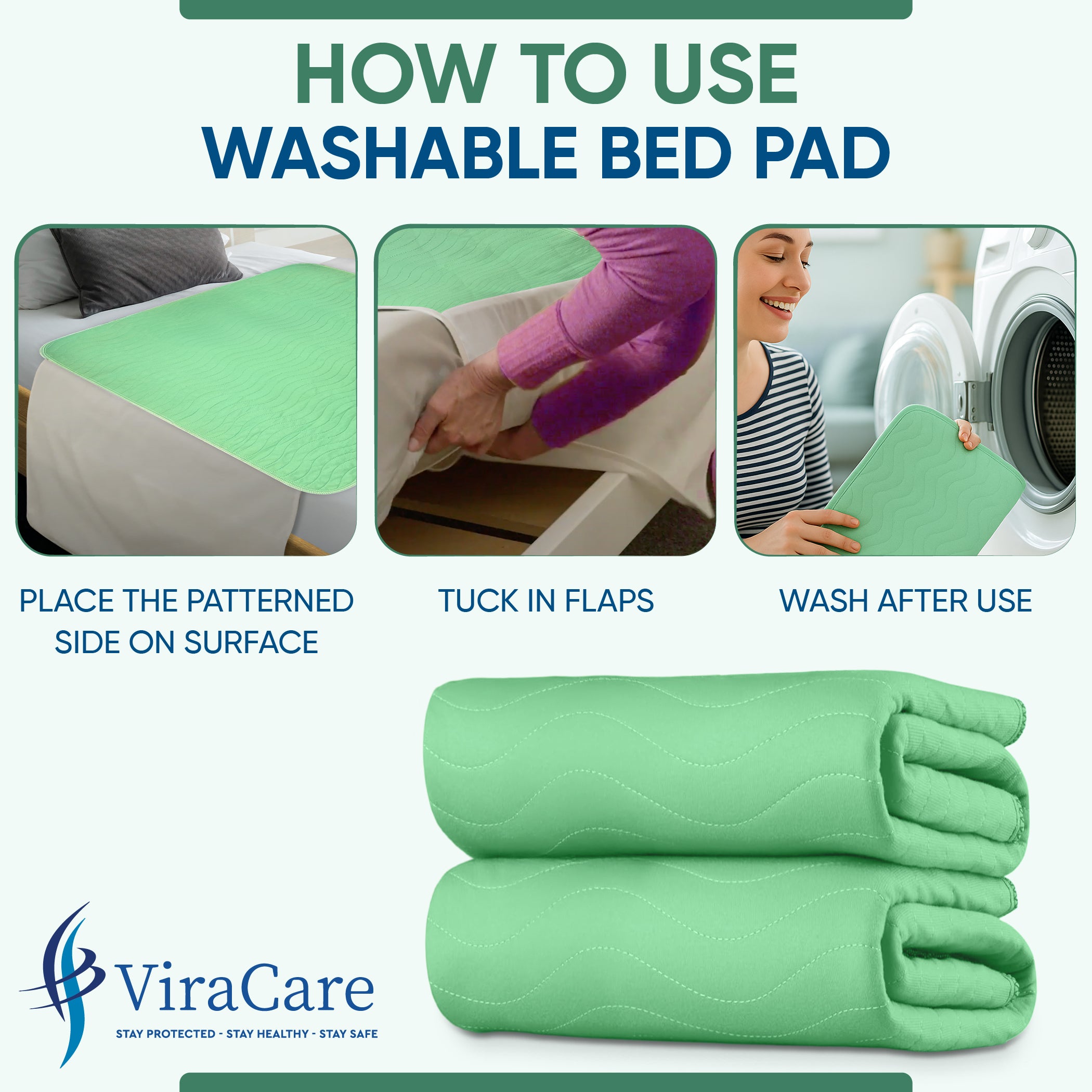 MACHINE WASHABLE, DURABLE & SECURE FIT: Waterproof mattress protector are machine washable and dryer-friendly, built to withstand repeated laundering without losing their shape or absorbency. ViraCare Bed mats include extended tuck-in flaps which secure the pad firmly under the mattress to prevent bunching or slipping. Stay protected with a pad that stays in place all night.